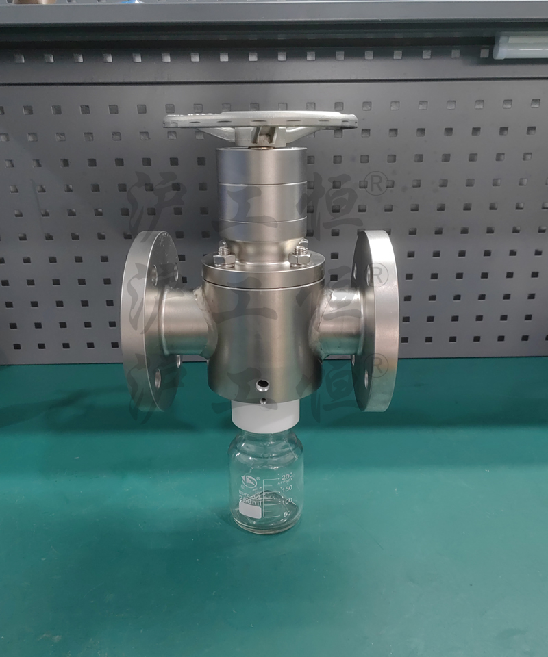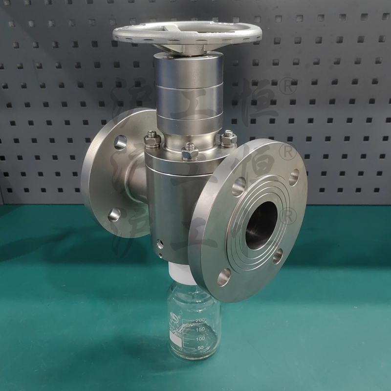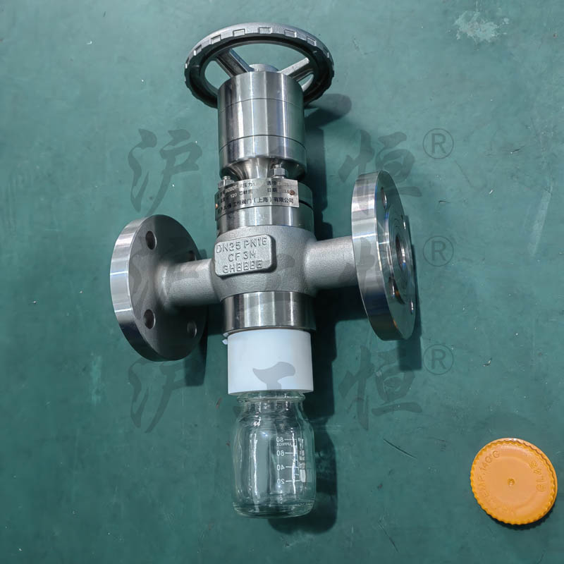 無滯留取樣閥解決了現有取樣閥的復雜結構,無滯留取樣閥主要有閥體、閥芯、閥桿、閥座、取樣瓶組成,取樣瓶為可拆卸設計,試樣通過取樣口進入取樣瓶內,避免污染試樣,流道無流阻、無滯留設計,不影響流量,閥桿通過手輪、電動執行機構、氣動執行機構旋轉帶動閥桿及閥芯,閥芯上下提拉,可精確控制流量,實現試樣進入取樣瓶內,取樣瓶可選透明和避光兩種,本取樣閥廣泛應用在制藥、化工、食品行業。