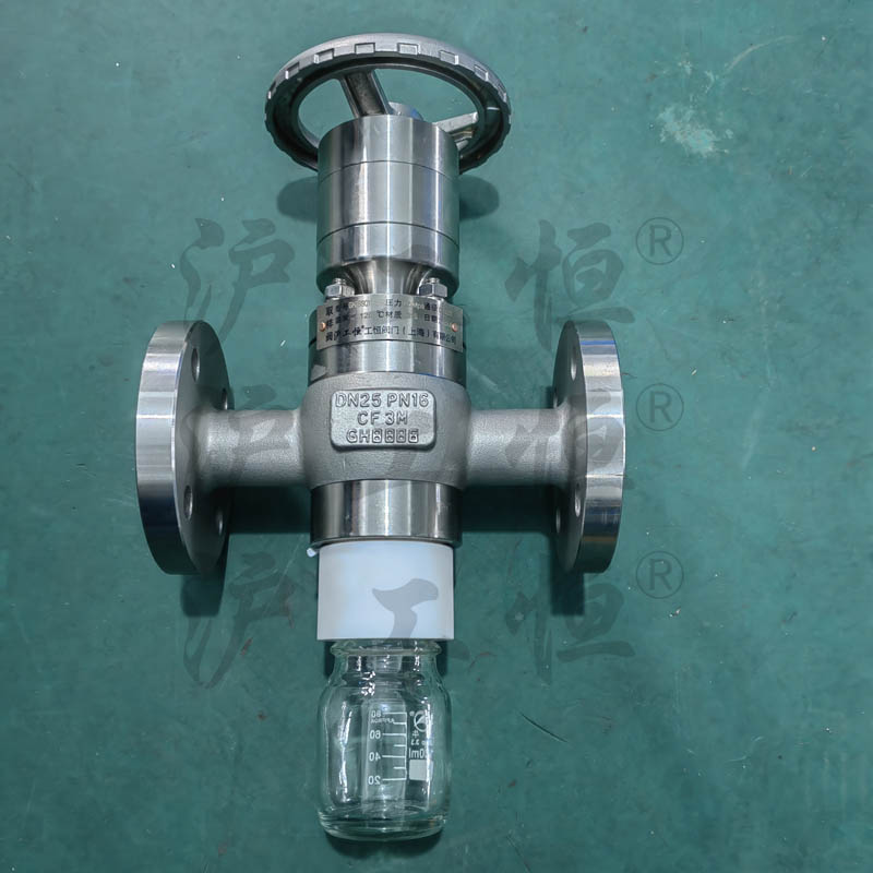 在線直通取樣閥解決了現有取樣閥的復雜結構,無滯留取樣閥主要有閥體、閥芯、閥桿、閥座、取樣瓶組成,取樣瓶為可拆卸設計,試樣通過取樣口進入取樣瓶內,避免污染試樣,流道無流阻、無滯留設計,不影響流量,閥桿通過手輪、電動執行機構、氣動執行機構旋轉帶動閥桿及閥芯,閥芯上下提拉,可精確控制流量,實現試樣進入取樣瓶內,取樣瓶可選透明和避光兩種,本取樣閥廣泛應用在制藥、化工、食品行業。